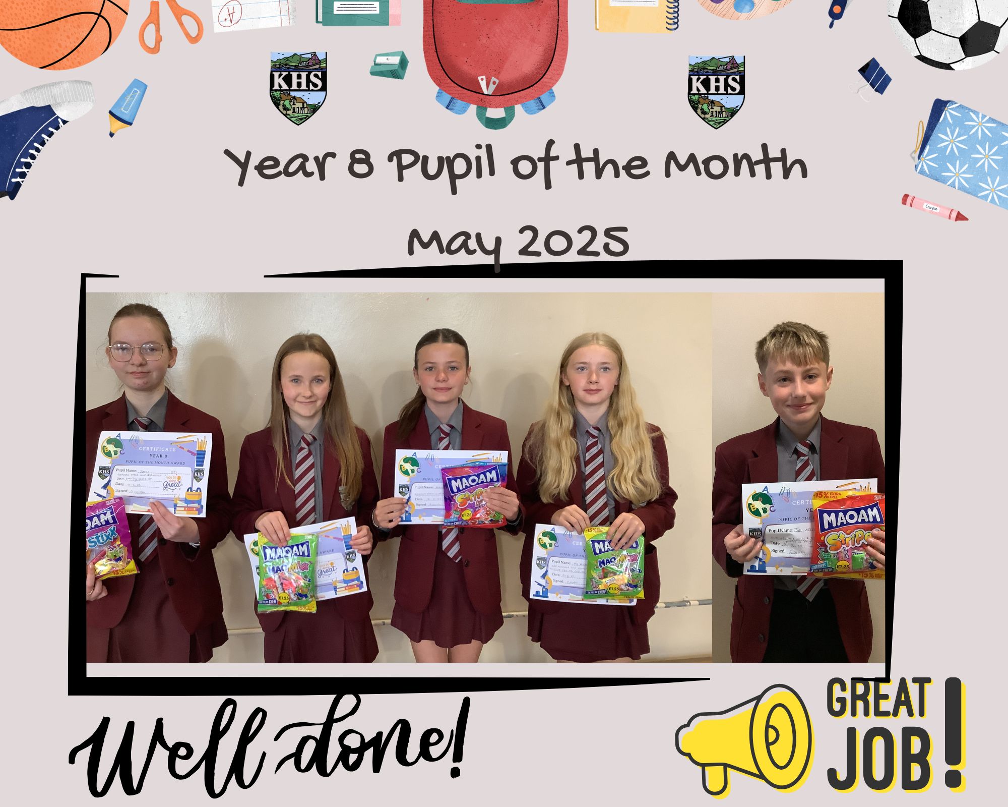 Year 8 pupils Sonnia, Katie, Ava, Abbie and Tyler were nominated as pupil of the month for May. These pupils have worked hard, behaved well and been role models to their peers. Well done Year 8! Keep making us proud!